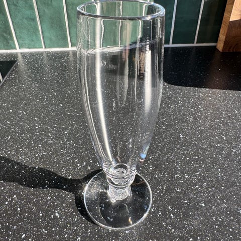 Jeg gir bort en glassvase. Den er tung og laget av tykt glass. Høyden på vasen er 25 cm.