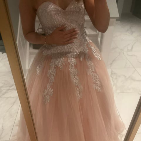 Fantastisk flott kjole til ball i en nydelig beige/champagnefarget nyanse. Merke Tina Ritzi. Kjolen ble kjøpt ny til ball i 2025 og da brukt en gang, og er i tillegg brukt på ett ball i 2026 (brukt to ganger). Minimalt synlig bruk på nederste kant (underskjørt).