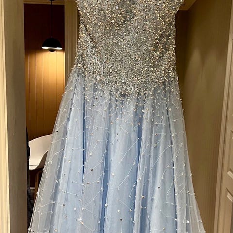 Str XS, kan snøres noe ut/inn, lengde ok til jente ca 160-165 (litt slep i gulvet om høyde 160). Overdelen har tettsittende fasong med dekorative detaljer, mens skjørtet faller vidt og langt. Egnet til formelle anledninger som fest, ball eller andre spesielle begivenheter.