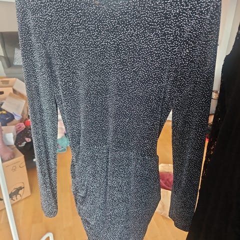 Nydelig mønstret kjole fra FREE/QUENT i størrelse XS. Mykt og behagelig stoff med lett stretch, lang erm og høy hals med rynkedetaljer. Sitter pent i midjen og faller fint i skjørtet – både komfortabel og flatterende.