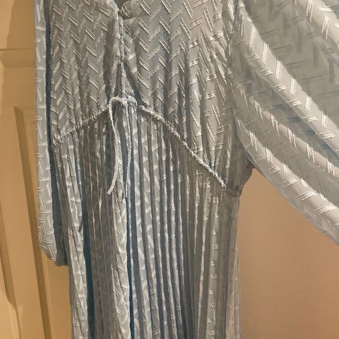 Ellos sommerkjole i størrelse 44. Kjolen har et flerfarget blomstermønster i hovedsakelig blåtoner på lys bunn. Omslagsfasong med V-utringning og knyting i livet. Voluminøse, korte ermer med lett puffeffekt. Lengden går omtrent til over kneet, avhengig av høyde. Passer som lett og luftig sommerkjole til hverdagsbruk eller enkle anledninger. Pris kan diskuteres.