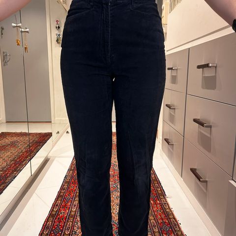 En bukse i myk bomullsfløyel med høy midje og gylf med knapp og glidelås. Smal passform. Utenpålommer foran med klaff og trykk-knapp. Utsvingte ben med press foran og bak.