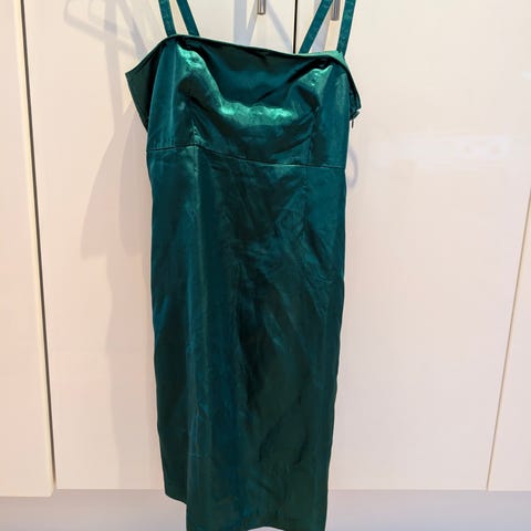 Festkjole i str S. Turkis velur. Modellen er kort strapless og drapert detalj i front. Glidelås i ryggen. Mykt poliester stoff med elastin.