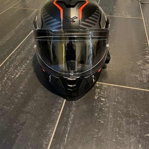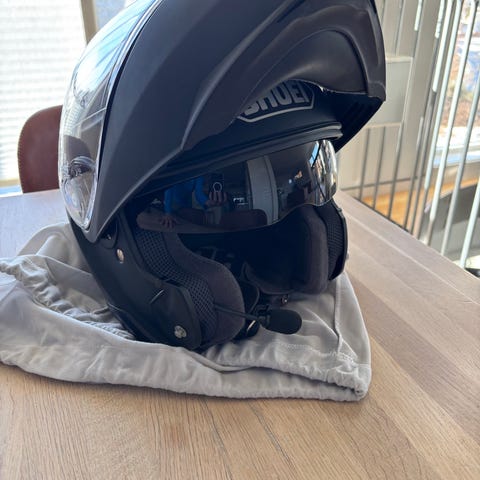 Dette er en åpningshjelm som jeg har montert medium sotet visir (CNS-3-MS) på. Dette er originalt fra Shoei. Dette ser tøft ut, samtidig er det helt fint å kjøre i tunneler og på ettermiddag/kveld. Det er også montert pinlock på visiret.