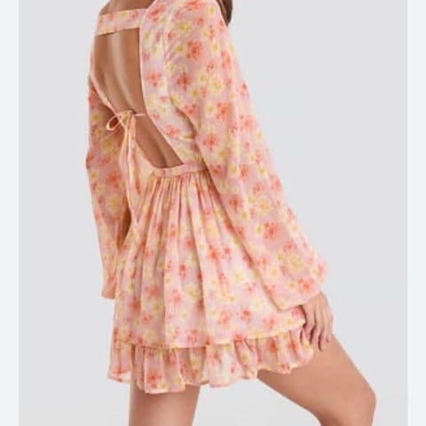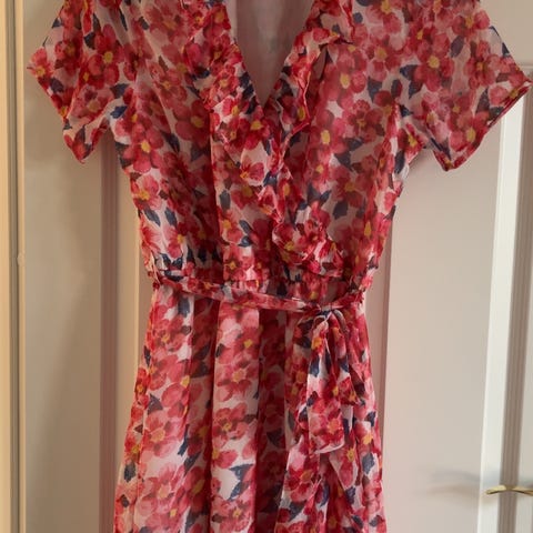 NA-KD sommerkjole for dame i størrelse M. Kjolen er flerfarget med blomstrete mønster i rosa og grønne toner på lys bunn. Den har V-utringning med omslagseffekt, lange ermer med strikk nederst og markert midje med lett rynking. Skjørtet er langt og vidt, og stoffet har en plissert struktur. Egner seg som lett sommerkjole eller til hverdagsbruk i varmere vær. Pris kan diskuteres.