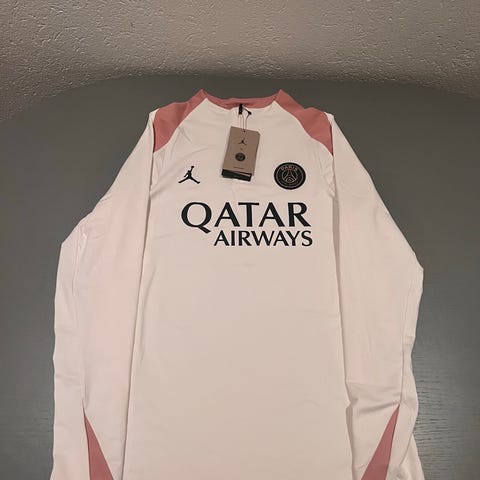 Jordan PSG fotballgenser for menn i størrelse S. Genseren er grå med mørke sprutmønster-detaljer og har halv glidelås i front. Paris Saint-Germain-klubblogo og sponsortrykk foran, samt trykk på ryggen. Laget i lett teknisk materiale egnet for fotball og annen trening, med lange ermer og høy hals for ekstra dekning.