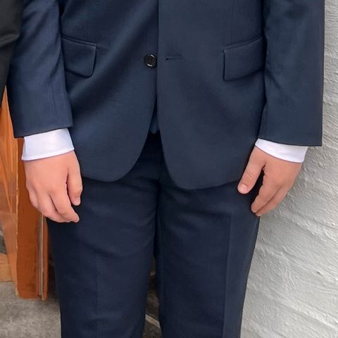 Oscar Jacobson dress til herre i størrelse 46. Dressen består av dressjakke, vest og bukse i blå farge.