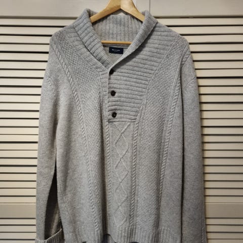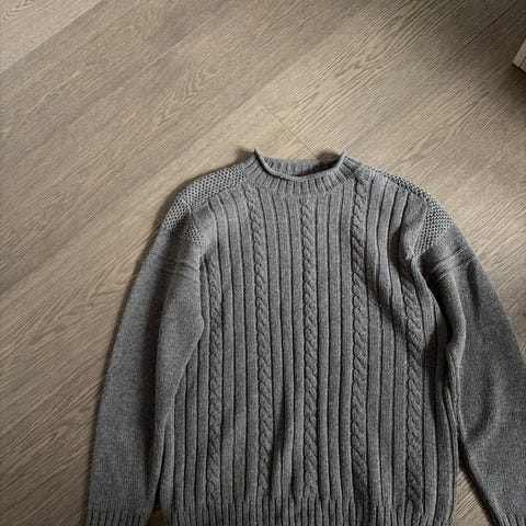 SAND Copenhagen ullgenser for herre i størrelse XL. Genseren er gråmelert med strukturstrikk og høy hals. Ribbestrikkede kanter nederst, på ermer og i hals. Materiale i 100 % ull gir et varmt og mykt plagg som egner seg godt til bruk i kjølige temperaturer, både til hverdags og fritid. Gensereb er kun brukt få ganger og fremstår veldig pent brukt. Gensereb har glidelås i halsen.