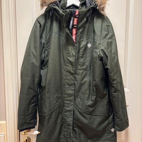 Fast, justerbar hette med snøring og stoppere. Hakebeskyttelse i børstet polyester. Toveisglidelås foran samt skjult trikot i ermekantene. Snor med stoppere i nederkant for regulerbar passform. To sidelommer med glidelås, innvendig kledde med varmende børstet polyester. En innerlomme med glidelås.