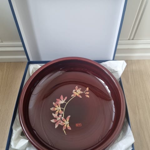 Selger for min mor en japansk orselensbolle med dekor i blått, rødt, grønt og oransje. Innsiden har blått mønster med blomsterdekor, mens utsiden har rødt bånd med blomster- og bladmotiv i flere farger. Bollen har bølget kant og glasert overflate. Undersiden er hvit med blå dekor langs kanten og stempel i midten. Egnet som serveringsbolle eller pyntegjenstand.