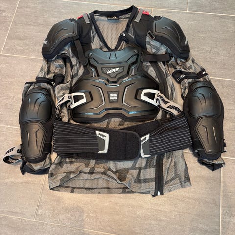 Leatt brystbeskyttelse og tilhørende motocrossutstyr for voksen fører. Settet på bildene inkluderer brystbeskyttelse fra Leatt, hvite knebeskyttere, et par motocrossstøvler samt trøye og bukse i flerfarget design. Utstyret er beregnet for bruk til motocross eller enduro og gir beskyttelse for overkropp, knær, albuer og føtter under kjøring. Sko størrelse 42, bukse størrelse 32, genser xl.
