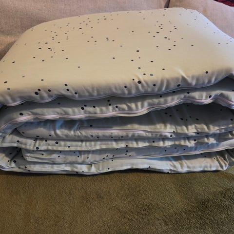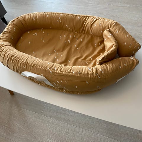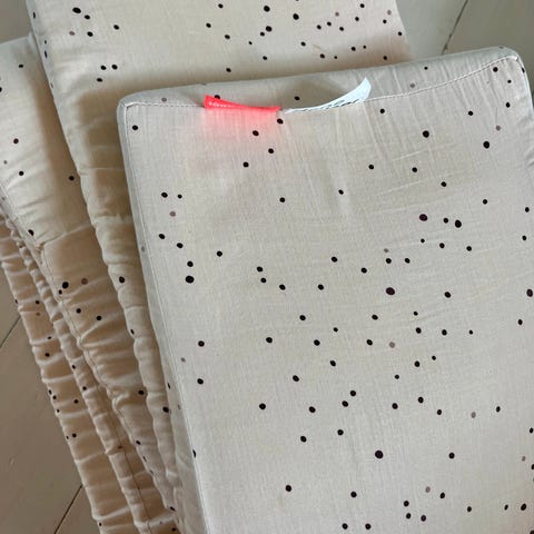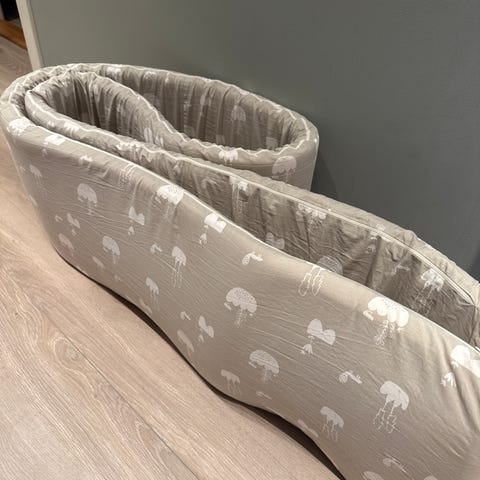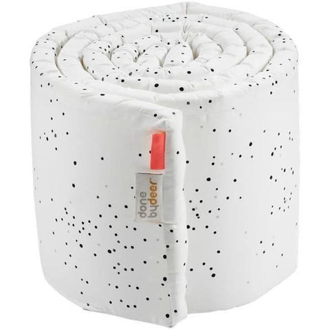 Done by Deer sengekant i myk tekstil. Naturhvitt trekk med trykk av sjøstjerner, skjell og bobler i dempede farger. Sengekanten kan brukes i sprinkelseng eller som myk omramming på lekeområde for baby. Trekket er vaskbart i maskin.