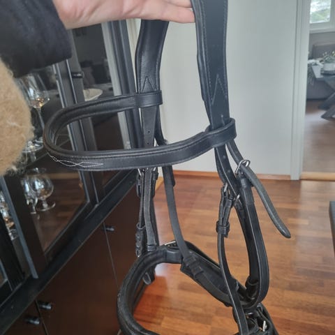 Svart hodelag str cob. Følger med nesereim med hjerte på. Går an å ta av og på. Og en ekstra pannereim og nese reim følger med. Tøyler kan være litt slitt. Bitt følger ikke med!