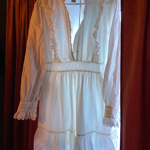 YAS hverdagskjole i størrelse XL for dame. Kjolen er grønn og laget i polyester. Den har strukturert stoff med bølgemønster, lange ermer med mansjetter og knappelukking foran med dekorative knapper. Kjolen har høy hals og glidelås i ryggen. Passer som hverdagskjole eller til enkle, pyntede anledninger.