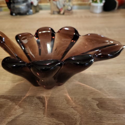 Glass skål på stett i gjennomsiktig glass med rosa tonet kant. Skålen har bølget form og står på en dekorativ fot. Egner seg til servering av godteri, snacks eller som borddekorasjon.