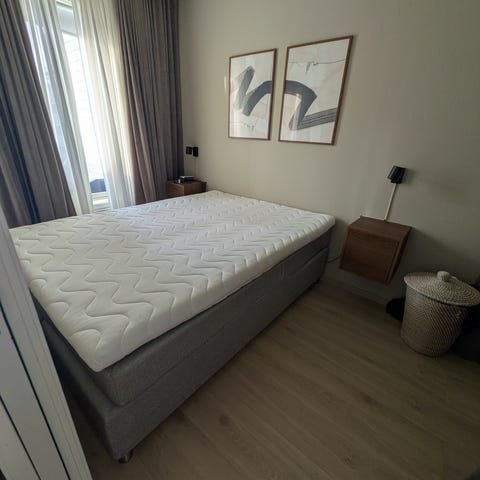 IKEA seng. Dobbeltseng med mørk sengegavl og underdel i stoff. Egnet for soverom med standard dobbel madrass. Passer til bruk med sengetøy i vanlig dobbel størrelse. Jeg kjøper størrelse 220 men man kan kjøpe mer eller mindre størrelse.