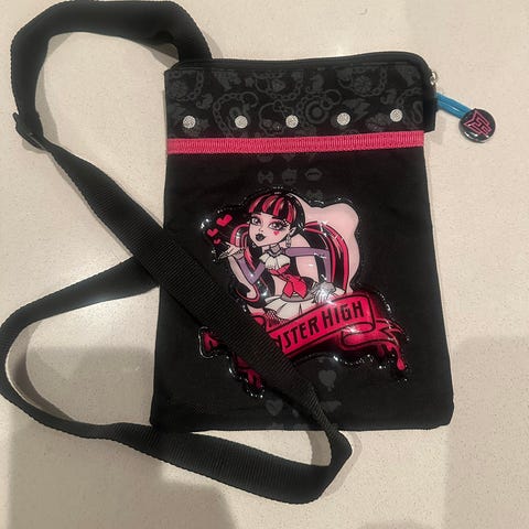 Selger denne superfine sekken fra Monster High! Vil tro den er fra 2010, selv om jeg fant en annonse på eBay der det sto at den er fra 2009. Tror ikke Monster High kom på markedet før 2010, men mulig jeg tar feil. 3 lommer med glidelås og charms. Pent brukt
