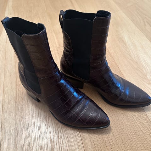 Svarte ankelstøvletter i ekte skinn, med preget krokomønster.