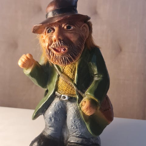 Bamse sparebøsse i keramikk, utformet som en stående bamse med hatt, ryggsekk og detaljerte klær. Flerfarget dekor med blant annet grønn jakke, beige bukse og svarte sko. Åpning for mynter på baksiden og gummipropp under for tømming. Egner seg som sparebøsse eller dekorasjon på barnerom eller i hyller.