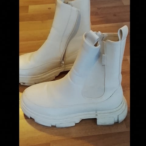 Sandro støvler i størrelse 38. Støvlene er i en lys beige farge med grov, chunky yttersåle og glidelås foran. Rund tå og middels høy hæl med kraftig platåsåle for stabilitet. Dekorativ metallknapp med S-logo på skaftet. Egner seg til hverdagsbruk i kjøligere vær.