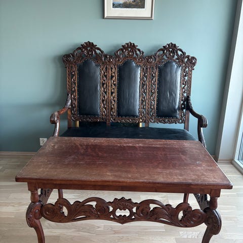 Mørkbeiset treverk og mønstret velourstoff med barokkmønster.