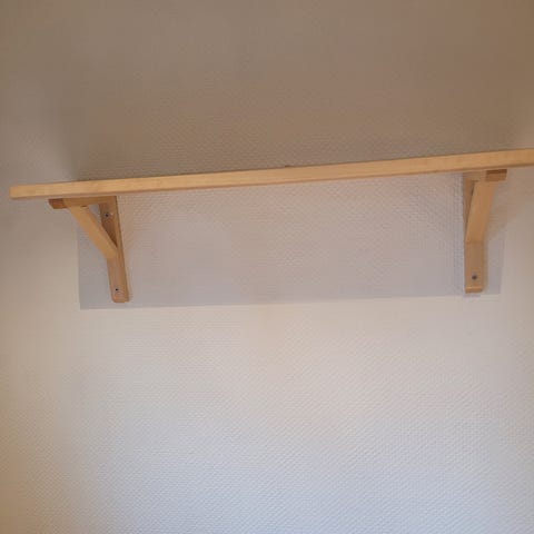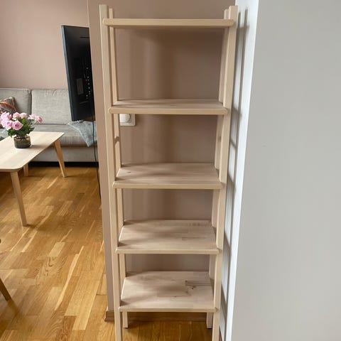 Hylle (Rågrund) fra IKEA, i bambus. Hylla har noen bruksmerker. En skrue mangler for å holde den øverste delen på plass, men det kan fikses.