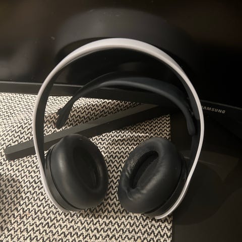 Sony Pulse 3D trådløst gaming-headset i hvit og svart farge. Over-ear hodetelefoner med polstrede øreputer og justerbar bøyle.