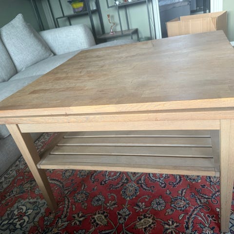 Salongbordet er meget pent brukt. Enkelte små riper i treet. Solid glassplate med underliggende treplate til lagring av nettbrett, fjernkontroller, tidsskrifter mv.