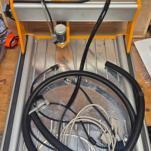 Kraftig cnc , med 2 motor på Y axis, kress 1050 w , ballscrew 1605 på alle axis , arbeid område ca Y-80cm X-70cm, vekt rund 100kg uten bord , påmontert liten 5w diode laser og dust shoe , ingen home sensors på den , må hetes på grunn av vekt og størrelse, lege en del bilde at ting laget på denne CNC