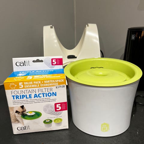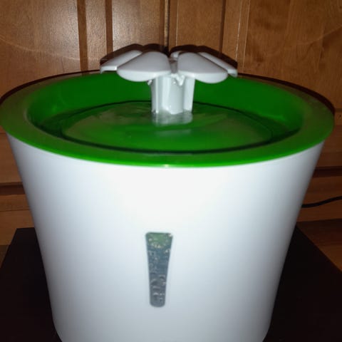 Catit Flower Fountain drikkefontene for katt i hvit og grønn plast. Fontenen har liten bruksskade på inneringen, den er fylt fungerende og har ingen negativt virkning. Det følger det med 4 måneder verd filterpatroner. Egnet som drikkefontene til katt eller små kjæledyr innendørs. Har kapasitet til 3 liter med vann
