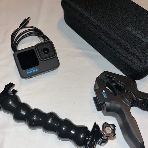 GoPro Hero10 Black actionkamera med frontskjerm og hovedlinse i sort utførelse. Kameraet er egnet for opptak av video og stillbilder i ulike aktiviteter og miljøer. Bildene viser et sett som inkluderer actionkamera, etui, festeutstyr, hodefeste, håndgrep/stang og en dobbel lader med 3 batterier. Utstyret kan brukes til montering på kropp eller utstyr for å dokumentere sport, reiser osv.