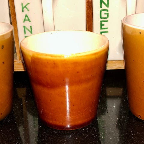 Tefatet har en diameter på 13,5 cm og koppen har en diameter på 9 cm + hank som kommer i tillegg og høyden på den er 5,2 cm og den rommer 1,5 dl . Den selges som den er og som den er vist på bildene . Den kan hentes hjemme hos meg eller så kan den eventuelt sendes .