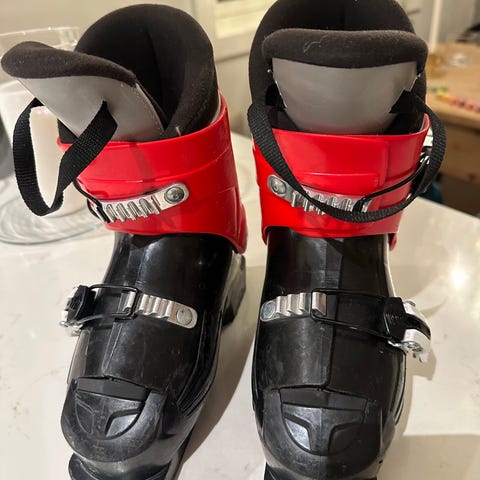 Atomic barn alpinstøvler/slalåmstøvler i svart og blå plast med justerbare spenner. Støvlene har myk og polstret innersko for komfort og støtte. Yttersålen er tilpasset vanlige alpinbindinger og har utskiftbare såledeler.