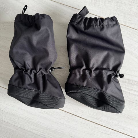 Passer som ytterlag over sokker for ekstra varme og beskyttelse ved bruk i vogn eller bæreseler, eller når babyen skal ut og krabbe i snø/gress/jord/sandkassa.