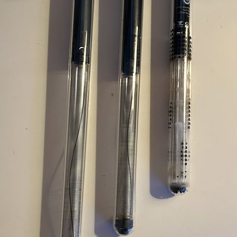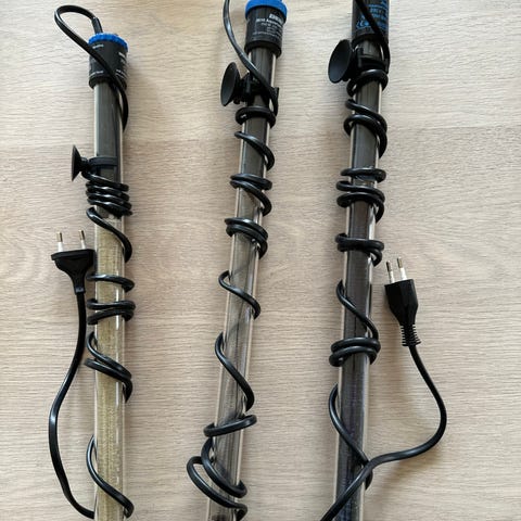 Akvarium varmeelement i glass, flere enheter og størrelser. Varmeelementene har justerbar termostat og strømledning med støpsel. Egnet for bruk i akvarier for å holde stabil vanntemperatur. Flere av enhetene har sugekopper for feste på innsiden av akvariet. Nøyaktig effekt (Watt) og lengde varierer mellom de ulike varmeelementene.