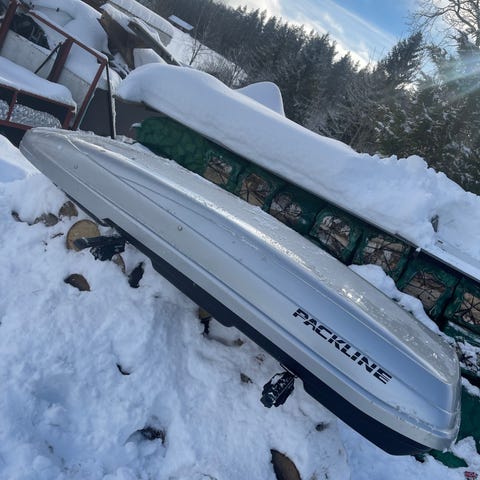 Packline takboks i svart farge. Aerodynamisk og lang modell som gir god lasteplass på biltaket. Takboksen har åpning fra siden og festepunkter for montering på takstativ. Egnet for transport av bagasje, ski og annet utstyr på bilens tak. Nøyaktige mål og volum er ikke oppgitt og bør eventuelt måles ved interesse.