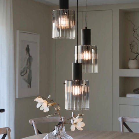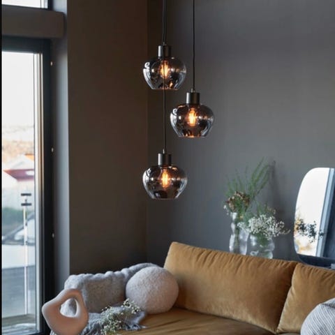 Denne taklampen er perfekt som et blikkfang over spisebordet eller over sofagruppen. De ulike glassfasongene sprer lyset på en myk og stemningsfull måte, som gir rommet en koselig og innbydende atmosfære.