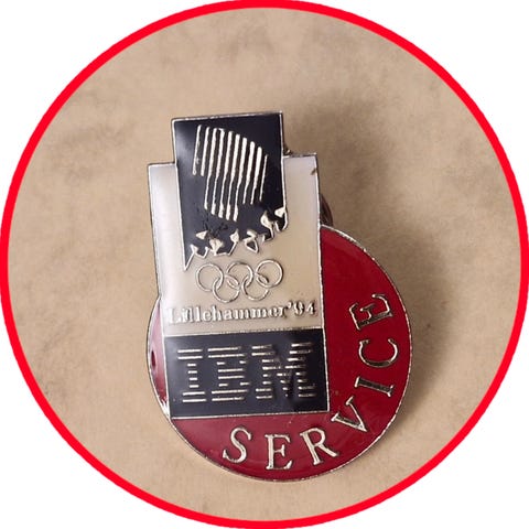 Selger en original IBM Service-pin fra OL på Lillehammer i 1994. Dette er den stilrene blanke versjonen (uten emaljefarger i IBM-logoen), utstedt til teknisk personell og samarbeidspartnere under lekene.