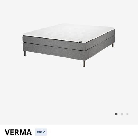 Jysk Verma kontinentalseng i størrelse 90x200 cm. Sengen har grå tekstiltrekk og rette metallben. Modellen er en enkeltseng som egner seg til soverom, gjesterom eller hybel. Overmadrass og øvrige detaljer kan variere avhengig av originalt kjøp og medfølgende tilbehør.
