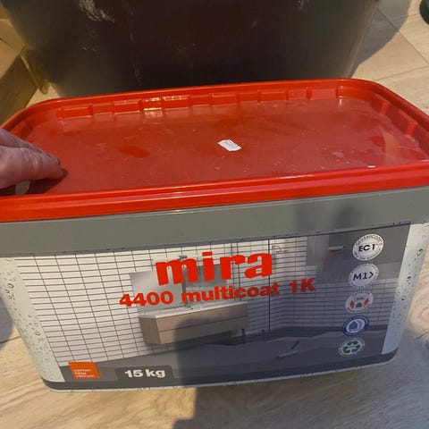 Mira 4400 Multicoat 1K smøremembran i spann, jeg har brukt litt, så er ca 8kg igjen. Kan også få med Mira 4180 primer i flaske, ca 1L igjen i den.