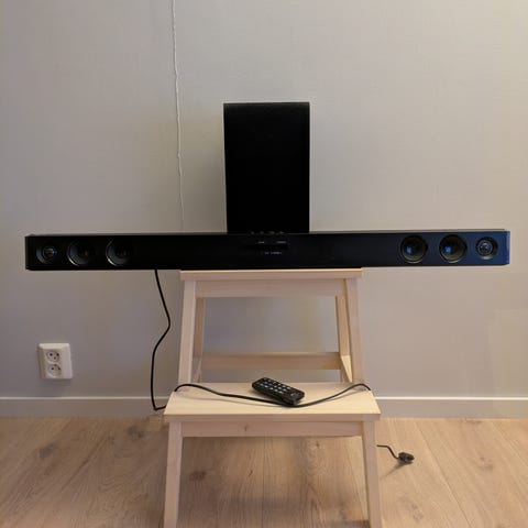 Brukt med synlige kosmetiske riper og bruksmerker på front og kabinett. Ingen synlige strukturelle skader observert på bildene. Strømkabel er fastmontert. Enheten er ikke funksjonstestet og antas å fungere. Kjøper kan returnere varen dersom den ikke fungerer som forventet. Ingen fjernkontroll eller subwoofer følger med.
