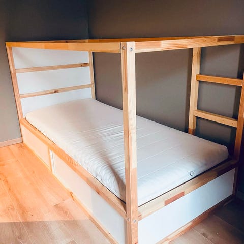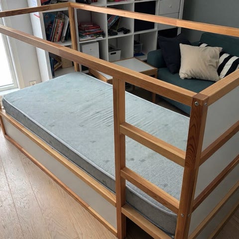 IKEA barneseng ramme i tre og hvit. Sengen har en solid treramme (noe slitasje på toppen) med hvite paneler på sider og ende, samt sengebunn med lameller i tre. Egnet som enkeltseng for barn. Madrass følger ikke med.