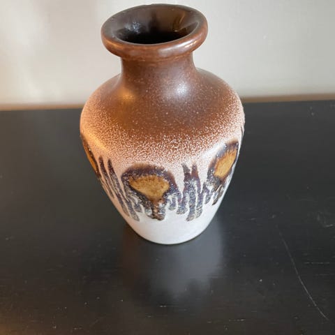 Keramikkvase i brun og hvit glasur med prikkemønster. Vasen har rund, svakt konisk form med smal åpning øverst. Overdelen er glasert i ensfarget brun, mens underdelen har hvit bakgrunn med jevnt fordelt prikkdekor i brun. Passer til mindre blomsteroppsatser eller som dekorativ gjenstand på bord, hylle eller vinduskarm. Bunnen er merket.