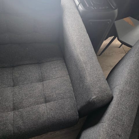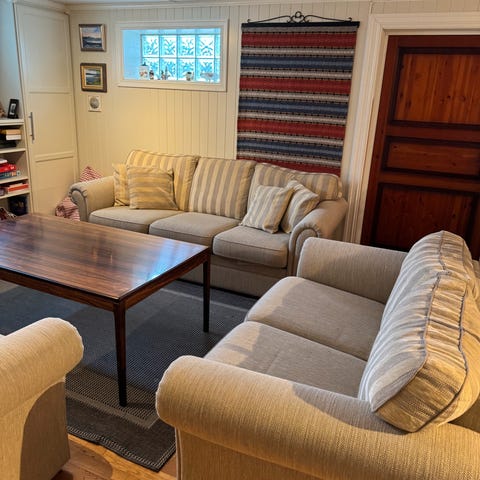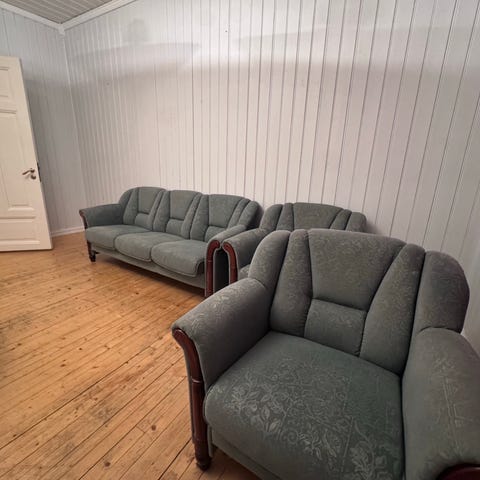 Møblene er brukt, men i grei stand og gir mange sitteplasser.