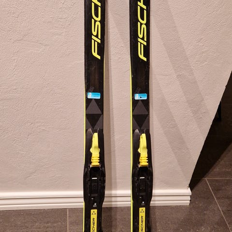 Fischer felleski selges for 500kr. Skiene har integrert fellesystem (twin skin) under sålen for feste. Tradisjonell festesmøring ikke nødvendig.