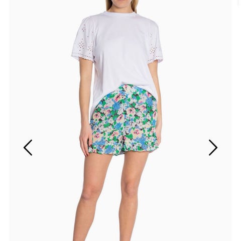 Heklet blondeshorts fra California & miss i str L/Xl (min vurdering er at den passer en str 34-36) i beige farge med innershorts. Aldri brukt. Rosa hatt fra Ganni med tags. Str M/L. Aldri brukt. Selges samlet.
