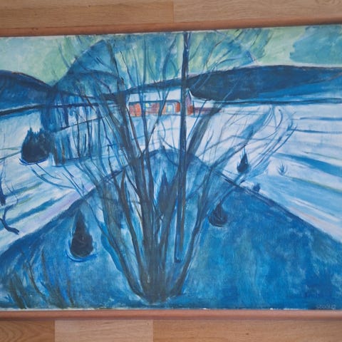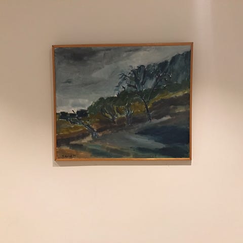 Maleri med landskapsmotiv som viser to personer som står på en sti ved vannet, omgitt av trær og åser i bakgrunnen. Fargebruken domineres av blå, grønne og lyse toner som gir et inntrykk av vår eller tidlig sommer. Bildet er innrammet i en 4 cm lys grå, enkel ramme. Egner seg som veggdekor i stue, gang eller andre oppholdsrom.