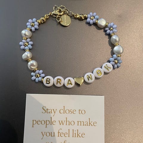 smykke for dame i plast. Smykket består av kjede med plastperler i ulike farger og bokstavperler, kombinert med et enklere lenkekjede. Egnet som motesmykke til hverdagsbruk.