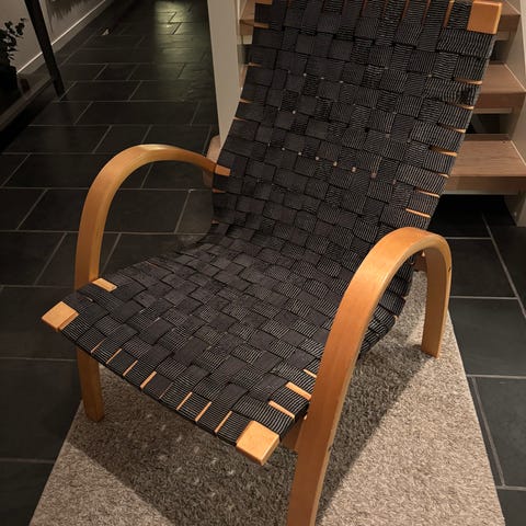 Klassisk stol med sort ramme, der sete og rygg er trukket med svarte/naturfargede hjortebånd. Stolen har buede armlener og understell i tre. Sitte- og ryggflate består av vevde hjortebånd i rutemønster, som gir god og fleksibel støtte. Øvre del av ryggen har en polstret nakkestøtte i sort skinn. Egnet som hvilestol i stue, lesehjørne og andre oppholdsrom. Stolen er lett flyttbar og passer inn i både moderne og klasisske omgivelser.