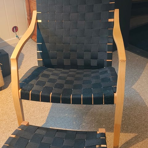 Klassisk og moderne stol/lenestol, sort ramme og svart/naturfargede hjortebånd